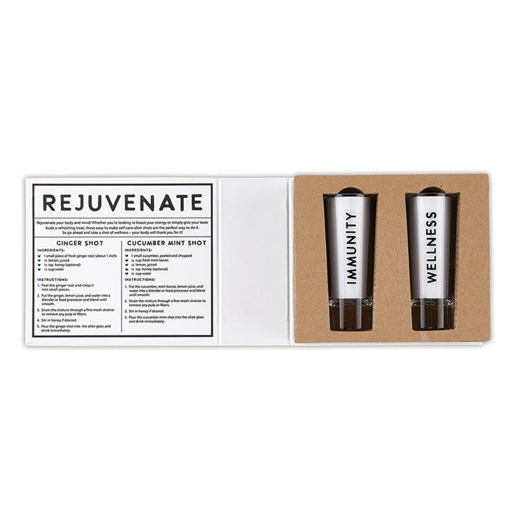 Rejuvenate your body and mind with our at home elixir book box set. This set includes two elixir glasses as well as accompanying recipes to help you make the perfect self care shots!